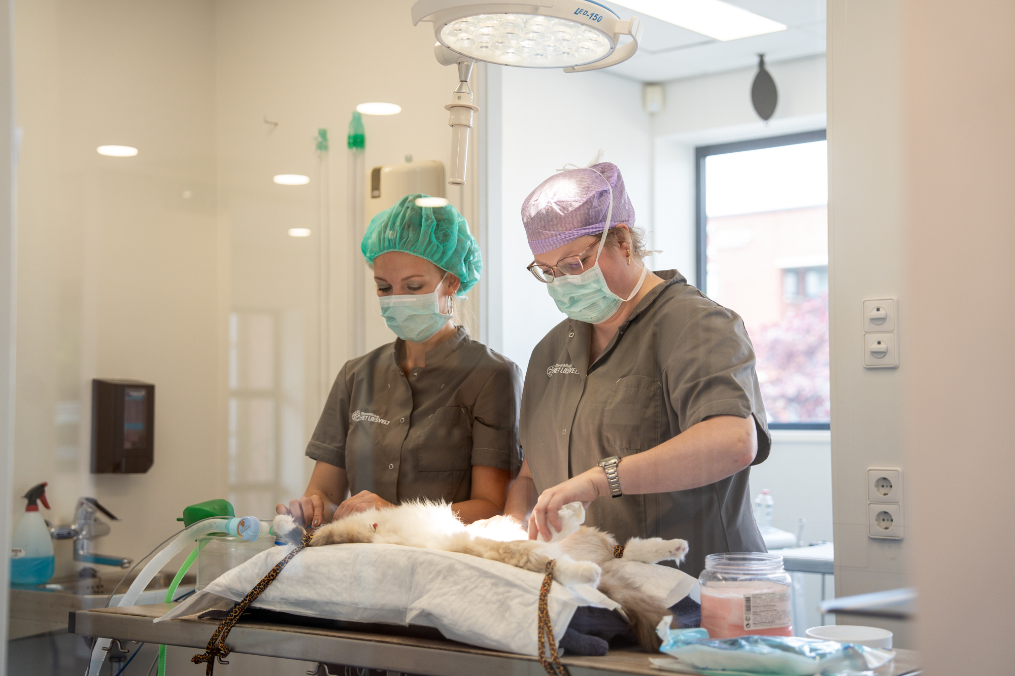 Bij ons op de praktijk vindt de sterilisatie plaats middels een buikoperatie. We maken een kleine snede in de buikwand. Hierna brengen we de eierstokken buiten de buikholte en binden we enkele bloedvaten af. We verwijderen enkel de eierstokken (ovarioectomie). Bij een volledige zogenoemde ovariohysterectomie verwijderen we ook de baarmoeder. Daarna hechten we de buikwand en huid weer. Soms kunnen we de hechtingen geheel inwendig plaatsen, zodat er geen uitwendige huidhechtingen nodig zijn. De kat mag dezelfde dag weer naar huis.