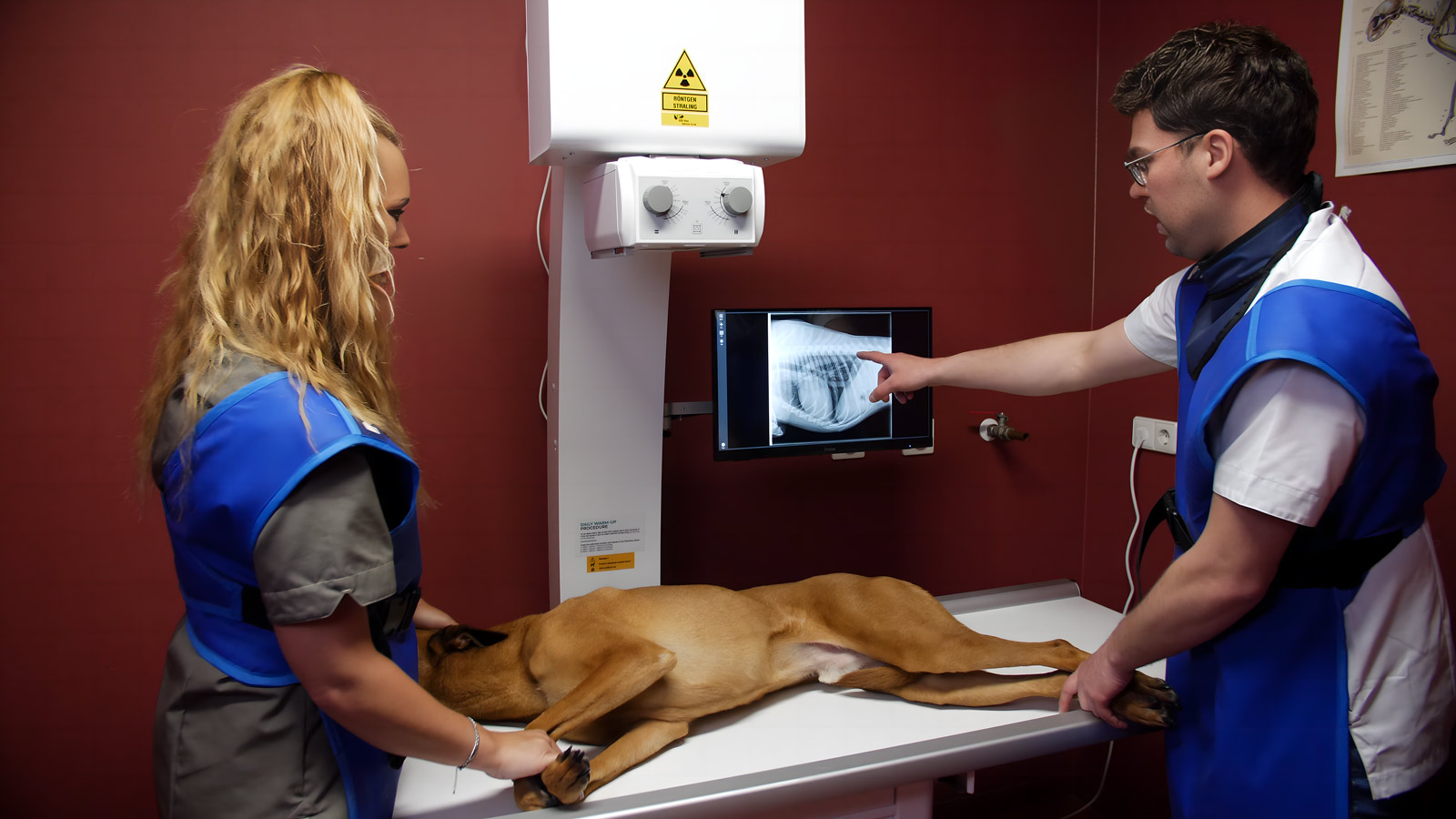Bij het maken van een röntgenfoto komt er schadelijke straling vrij. Alleen strikt noodzakelijke personen mogen dus aanwezig zijn bij het maken van een foto. Deze personen zullen beschermende middelen dragen om de straling tegen te houden. In de wanden en deur van de röntgenkamer zit lood verwerkt zodat de straling binnen de kamer blijft. Wij zullen u dus in de meeste gevallen verzoeken om even buiten de röntgenkamer te wachten. Na het maken van de röntgenfoto’s kunt u deze uiteraard samen met de dierenarts bekijken.